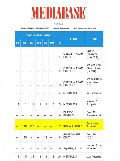 MARCH 2023 - "American Thunder" by RFK ALL STARS, the lead track from the new "LIVE THE ROCK Volume One" compilation, explodes into the Top 10 on the Mediabase daily Classic Rock chart.