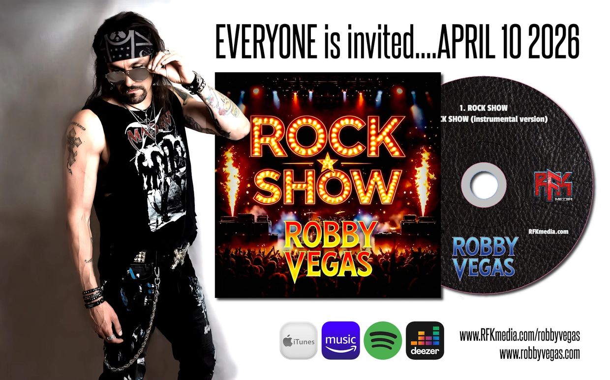 “Rock Show” explodes on all digital/streaming platforms on April 10, in conjunction with Robby’s appearances on the 2026 Monsters Of Rock Cruise April 12-17. The CD single will be available on the cruise, and Robby’s looking forward to autographing your copy on board (performances are in The Social Night Club on Deck 6 – check the MORC schedule and support this exciting new artist).